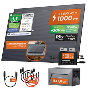 Solarway® 1000W Balkonkraftwerk mit Speicher 800W komplett Steckdose - neuester 800 Watt Wechselrichter - 1,6 kWh Anker Solix 1 - 500W bifaziale Solarmodule & Envertech & Anker Kundenbewertung: 4,13 von 5 Sternen -65 % Sie Sparen 65 Prozent, UVP 2.399.– UVP : 2399,–€ ab 829.99* ab 829,99€ Sternchen Fußnote, Details am Seitenende +30€ Filialgutschein Kampagnen Artikel+30€ Filialgutschein Zum Artikel