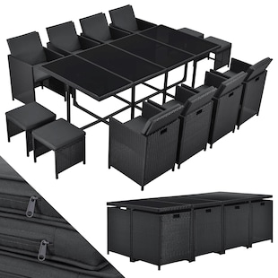 Unsere 9-teilige Gartengarnitur bietet Sitzmöglichkeiten für bis zu 8 Personen und zeichnet sich durch eine besonders platzsparende Verstaubarkeit aus. Die Garnitur umfasst vier Stühle, vier Hocker und einen großen Tisch mit Glasplatte, wodurch sie sich sowohl zum Essen als auch zum Entspannen eignet.