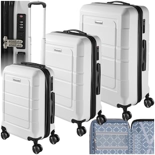 tectake® Reisekofferset, 3-teilig aus robustem ABS-Kunststoff mit Polycarbonat-Beschichtung, 360° drehbare, abnehmbare Gummirollen, mit Teleskopgriff nur 94.99* nur 94,99€ Sternchen Fußnote, Details am Seitenende Zum Artikel