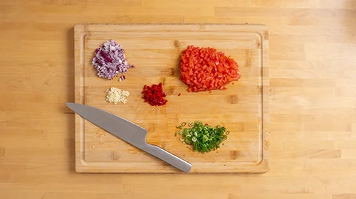 1. Das Gemüse waschen und in feine Würfel oder Ringe schneiden.