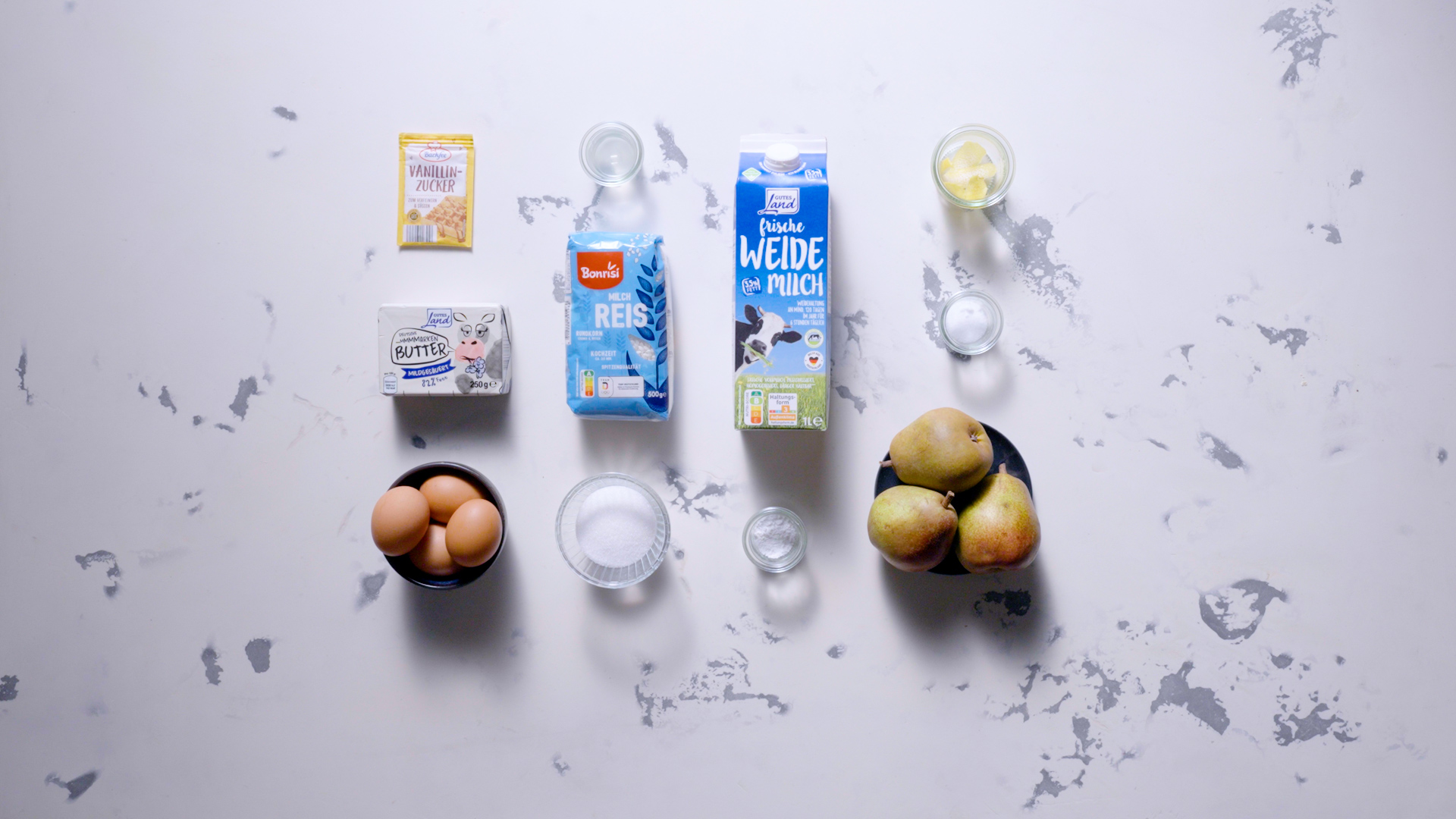 Birnen waschen, vierteln, Kerngehäuse entfernen und das Fruchtfleisch in Spalten schneiden. In die Reismasse setzen und leicht eindrücken. Die Soufflés im vorgeheizten Ofen ca. 30 Minuten goldbraun backen.
