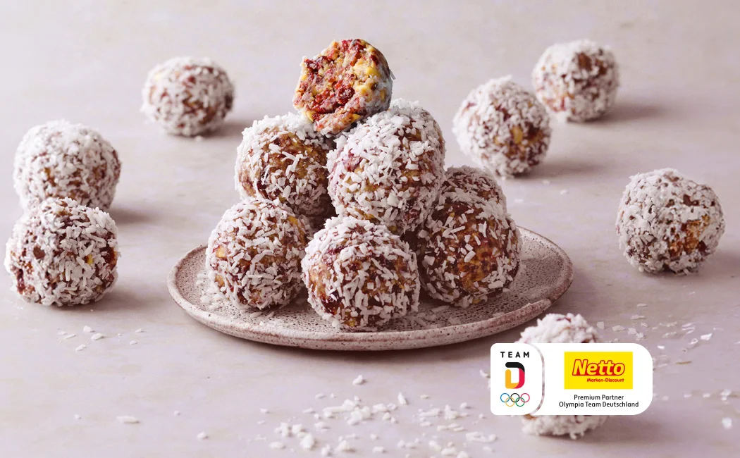 - Die Bällchen in den Kokosraspeln wälzen, bis sie rundum bedeckt sind.