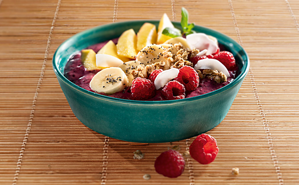Das Obst und und die Kokosraspeln auf die Bowl drapieren und mit Chiasamen, Knuspermüsli, Limettenabrieb und den frischen Beeren garnieren.