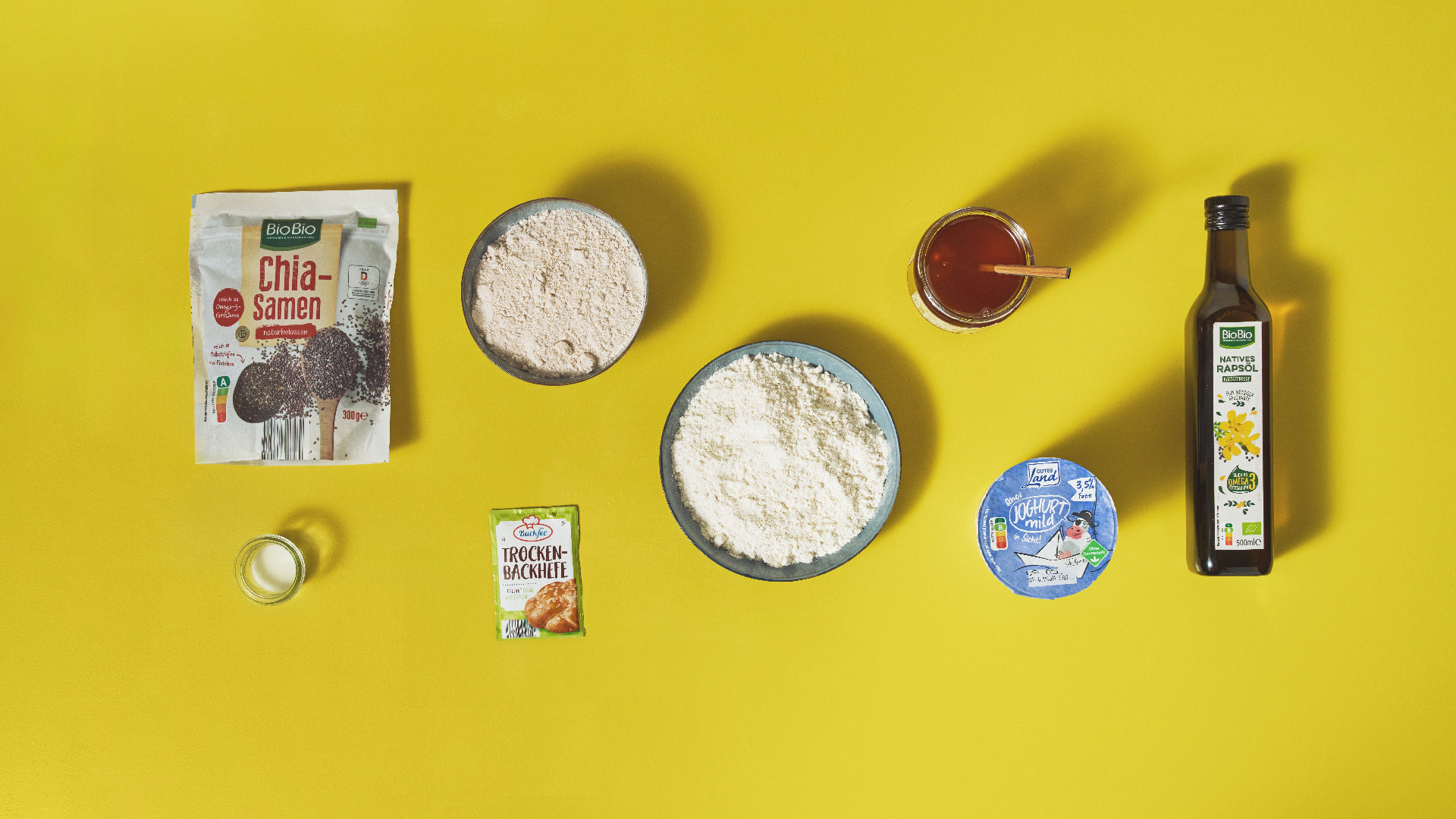 Trockenhefe in 100 ml lauwarmes Wasser geben und anschließend den Honig hinzufügen. Alles verrühren bis sich die Hefe im Wasser gelöst hat. Nun das Vollkorn-Dinkelmehl und das Weizenmehl zusammen mit einem gehäuften TL Salz in der Rührschüssel mit der Küchenmaschine vermischen. Danach das zuvor vorbereitete Hefewasser sowie Joghurt und Öl dazugeben. Alles mit dem Knethaken der Küchenmaschine etwa 5 Minuten lang zu einem glatten Teig verkneten. Diesen abgedeckt für etwa 1 Stunde an einem warmen Ort gehen lassen.