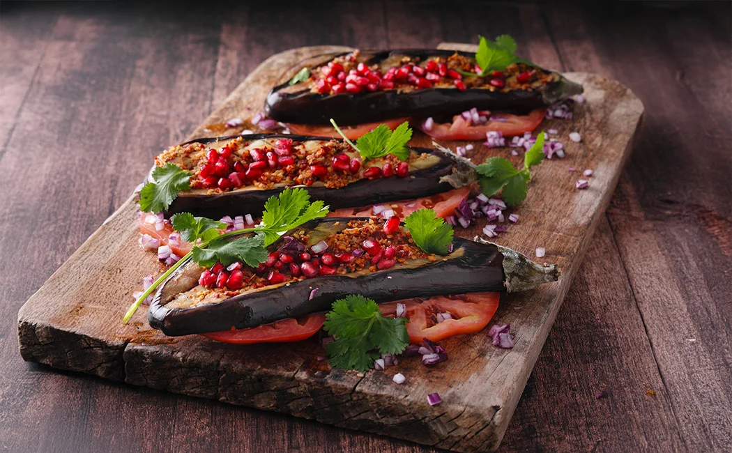 - Fleischtomaten waschen und in Scheiben schneiden. Rote Zwiebel abziehen und fein würfeln. Tomatenscheiben auf Tellern anrichten und mit Zwiebelwürfeln bestreuen. Die Auberginen darauflegen, mit Koriandergrün garnieren und mit Granatapfelkernen bestreuen.