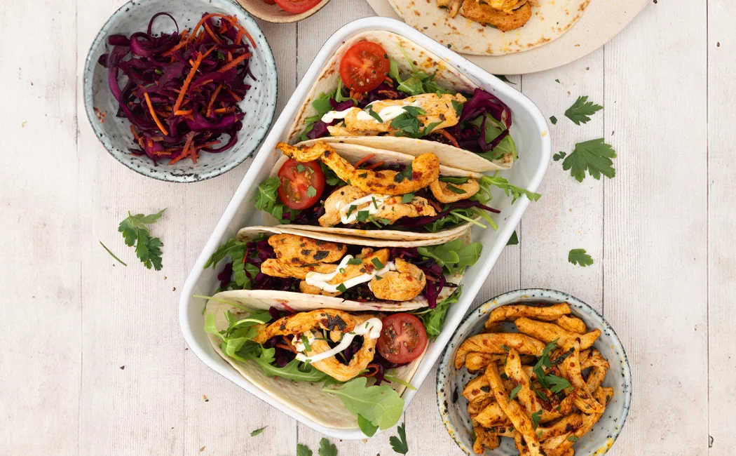 - Weizentortillas erwärmen und mit Kohlmischung, Fleisch, roten Zwiebeln, Frühlingszwiebeln, Koriandergrün füllen und mit je 1-2 EL Schmand toppen.