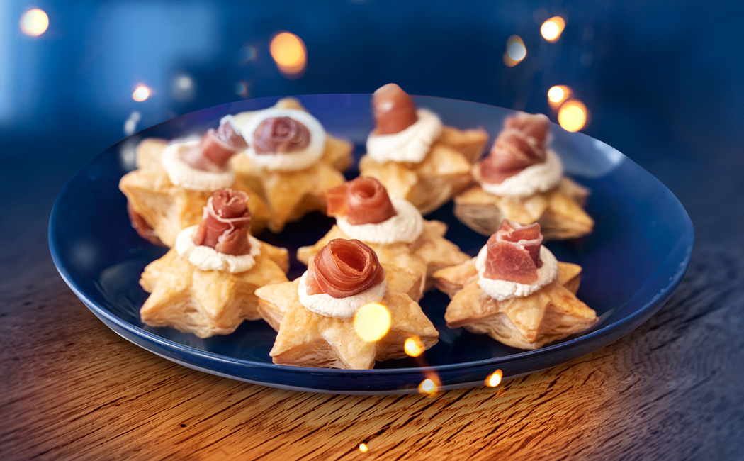 Den Frischkäse und einen Schuss Milch dazugeben und glattrühren. Mit einer Prise Salz und Pfeffer würzen. Anschließend jeweils einen Teelöffel der Masse auf einen Blätterteig-Stern geben.