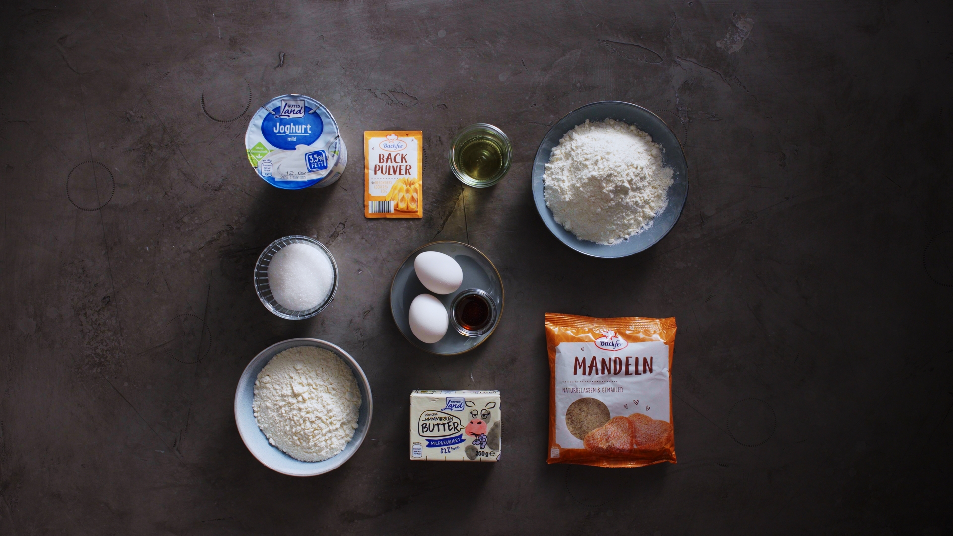 Die Eier mit dem Pflanzenöl, Zucker und Joghurt verrühren. In einer Rührschüssel Mehl, Mandeln und Backpulver mischen, dann die Eiermasse zügig darunterrühren.