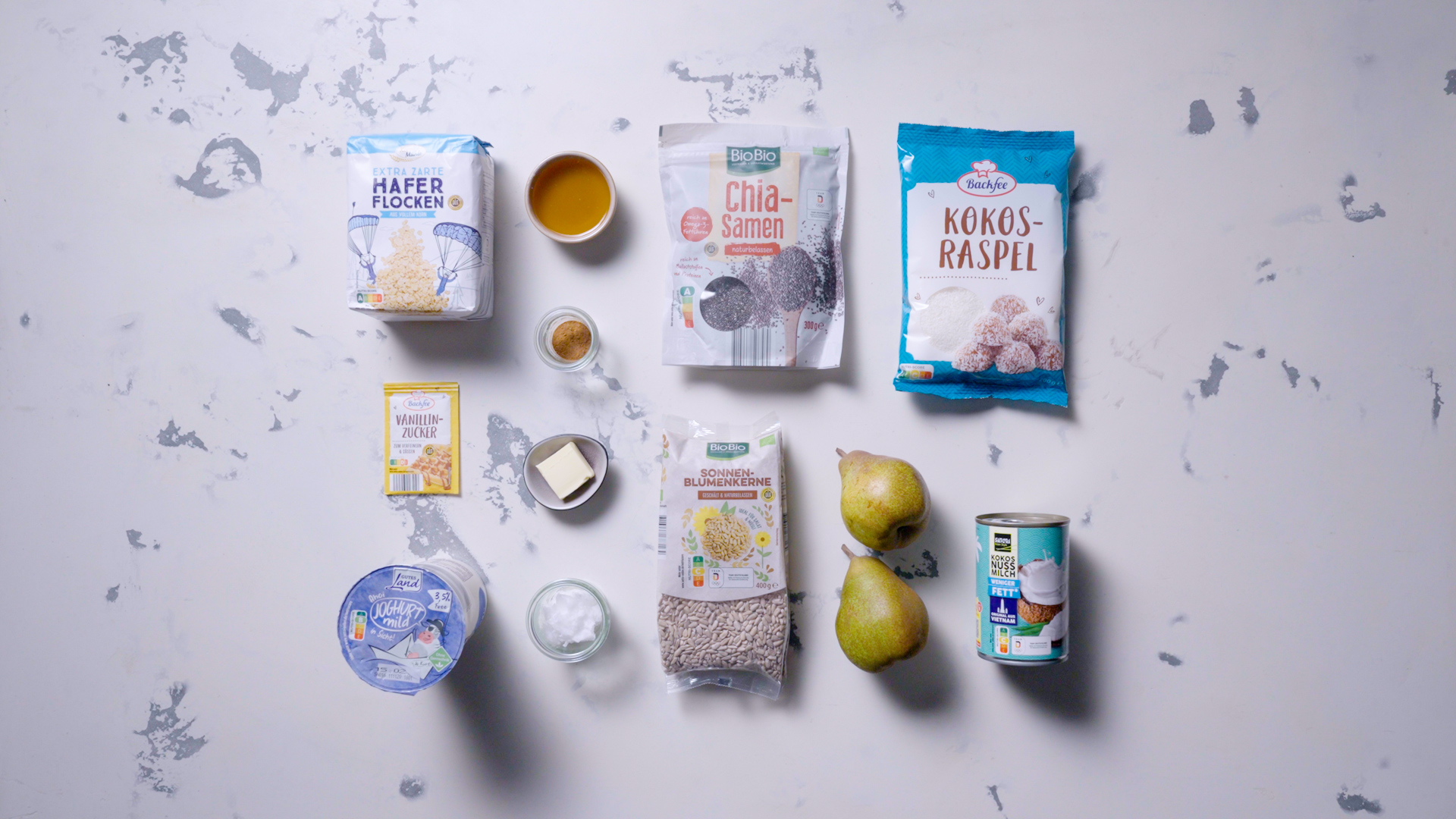 Die Birnen waschen, schälen, halbieren, Kerngehäuse entfernen und das Fruchtfleisch in Spalten schneiden. In einer Pfanne in der Butter mit dem restlichen Honig, Zimt und Vanillinzucker 3–4 Minuten leicht bräunen. Zur Seite ziehen und abkühlen lassen. Zum Servieren Gewürzbirnen und Streusel auf den Overnight Oats verteilen.