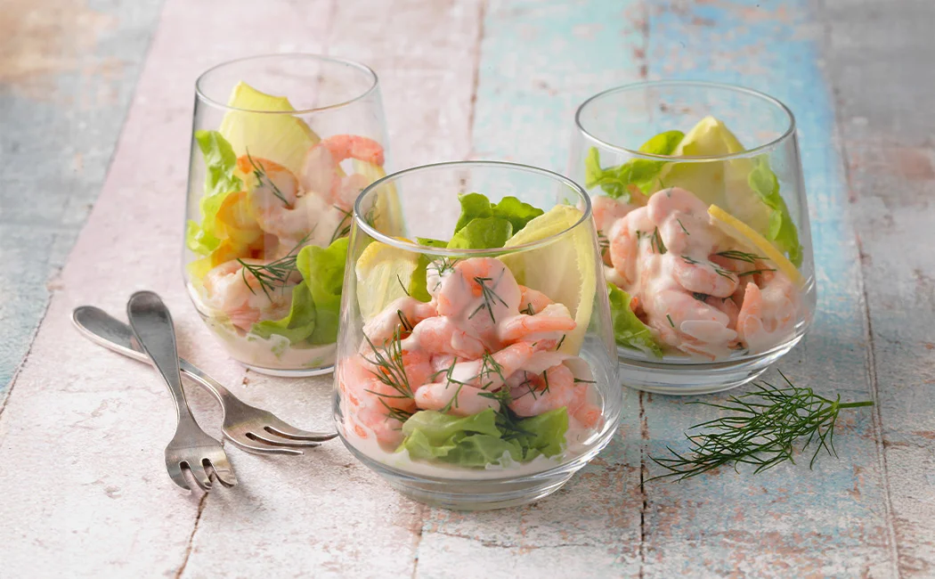 - Die Cocktailsauce mit dem Dill und den Krabben vermengen. In Gläsern anrichten und mit Chicorée garnieren (nach Belieben noch Mandarinenfilets aus der Dose dazugeben).