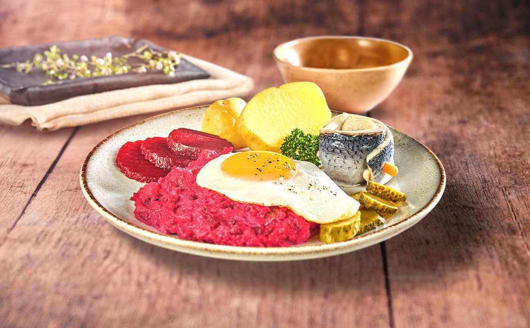 Das Labskaus auf Tellern anrichten, die Spiegeleier darauf setzen. Rollmöpse daneben verteilen und mit Essiggurken und Roter Bete garnieren.