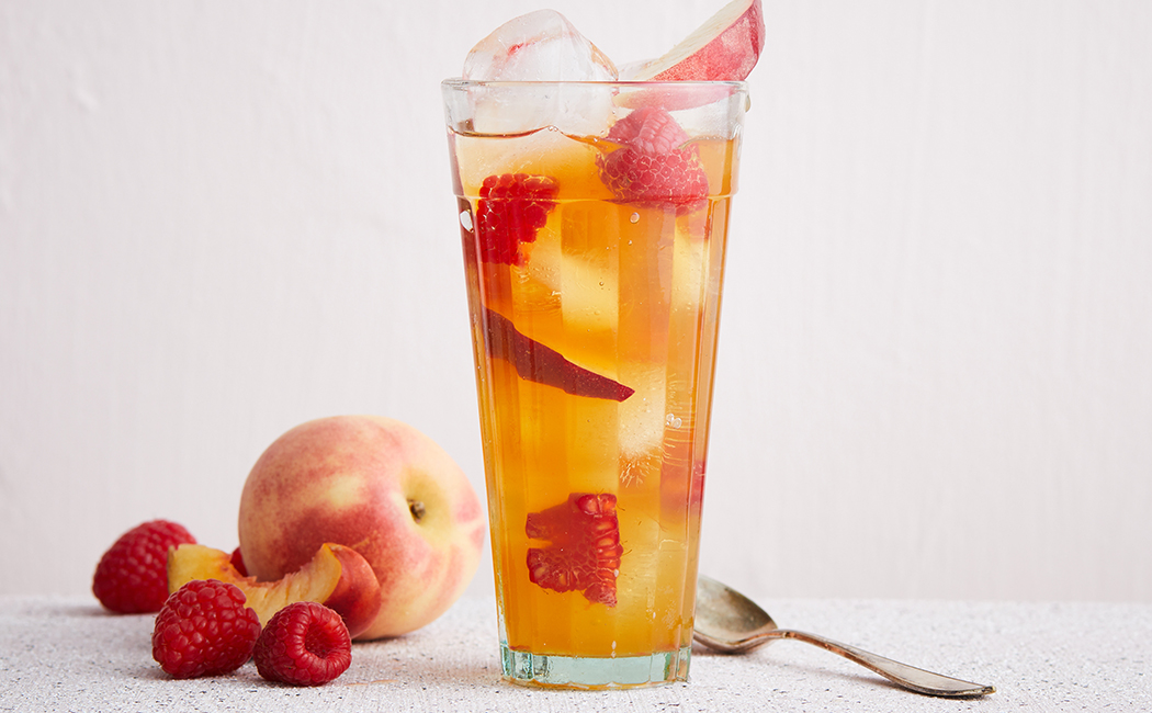 Den Liquor 43, Three Sixty und Eistee abmessen und zu den Früchten geben.