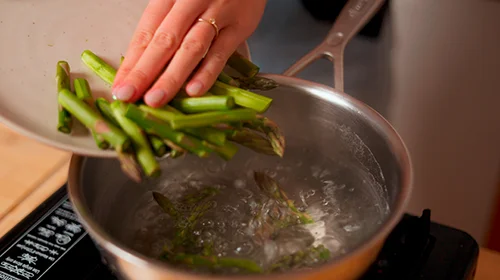 Den Spargel waschen, im unteren Drittel schälen und holzige Enden entfernen. In mundgerechte Stücke schneiden und in kochendem Salzwasser 4 Minuten blanchieren. In Eiswasser abschrecken und abtropfen lassen.