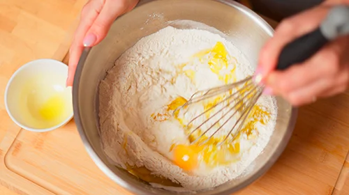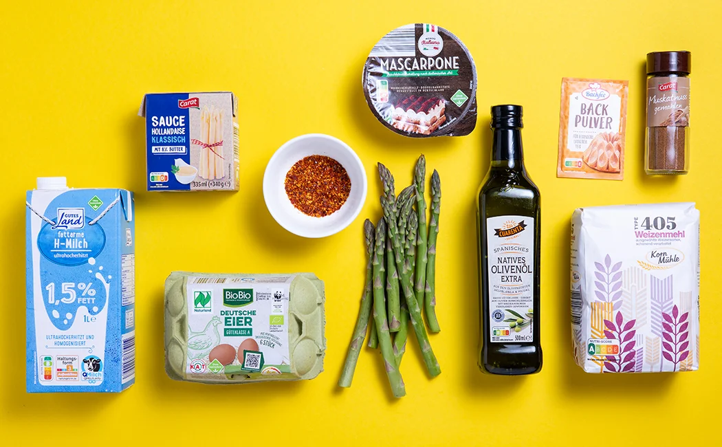 Weizenmehl, Backpulver und Natron vermengen. Eier, Olivenöl und Milch verrühren. Alles, mit der Mascarpone rasch zu einem glatten Teig verarbeiten; mit 2-3 Prisen Salz und mit Muskat würzen.
