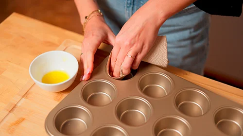 Den Backofen auf 180 °C Ober- und Unterhitze vorheizen, ein 12er Muffinblech fetten.