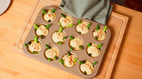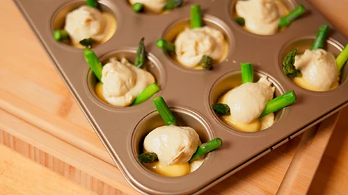 Die Vertiefungen zu etwa ein Drittel mit Teig füllen, darauf je 1 EL Hollandaise verteilen. Den Spargel in die Muffins stecken und mit restlichem Teig auffüllen.