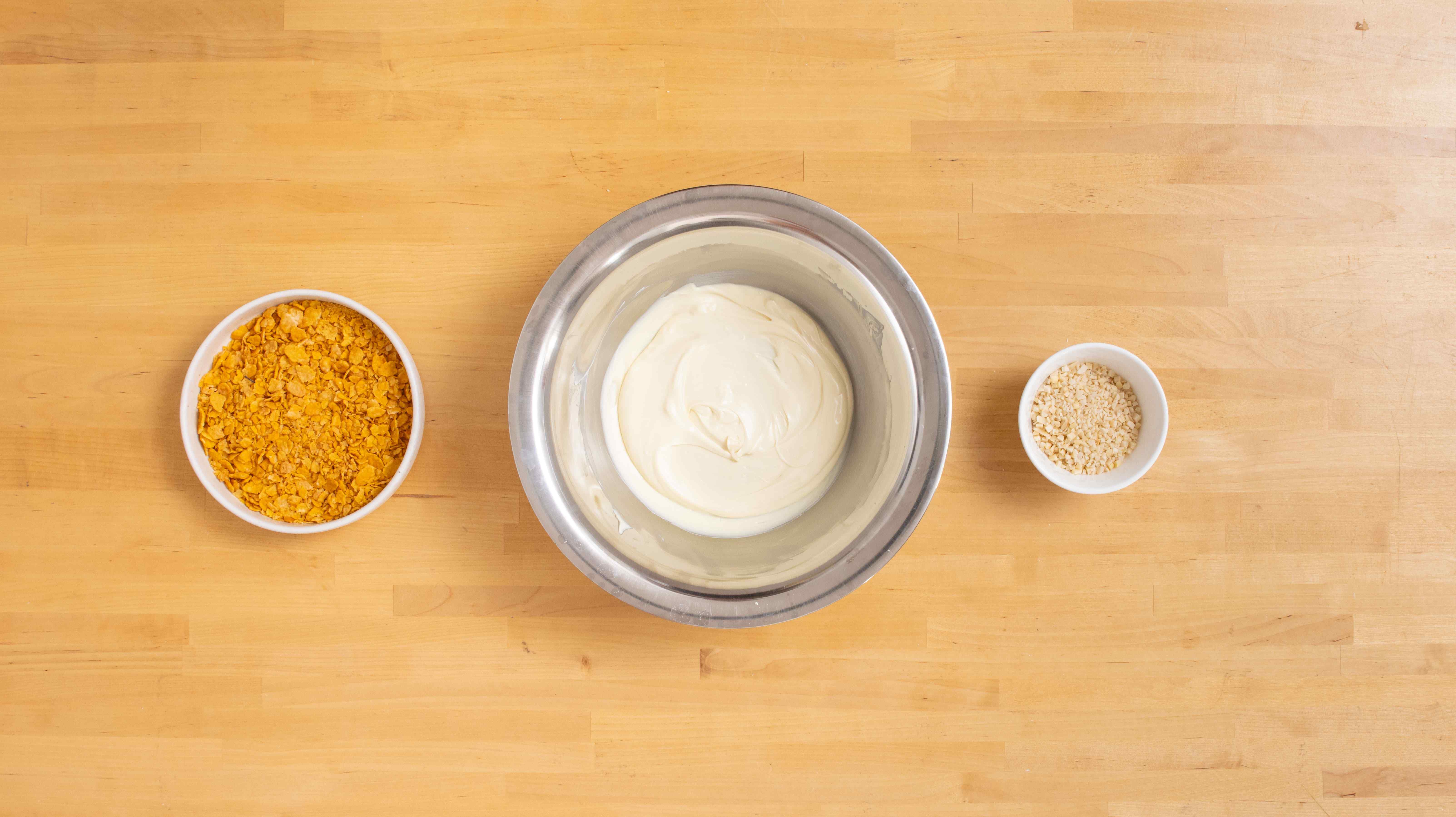 - Weiße Kuvertüre hacken, schmelzen und mit zerbröselten Cornflakes sowie Mandeln vermengen.