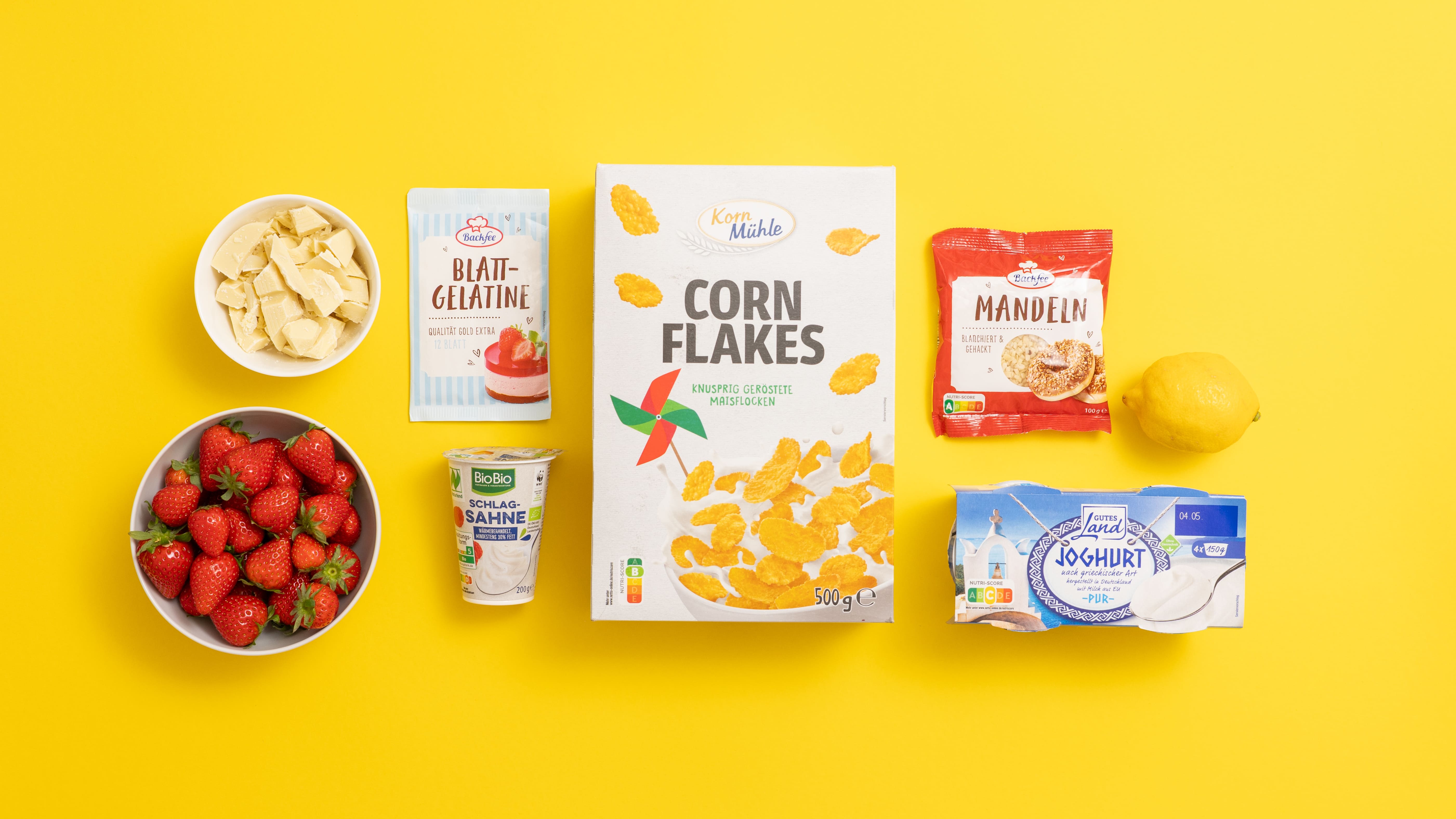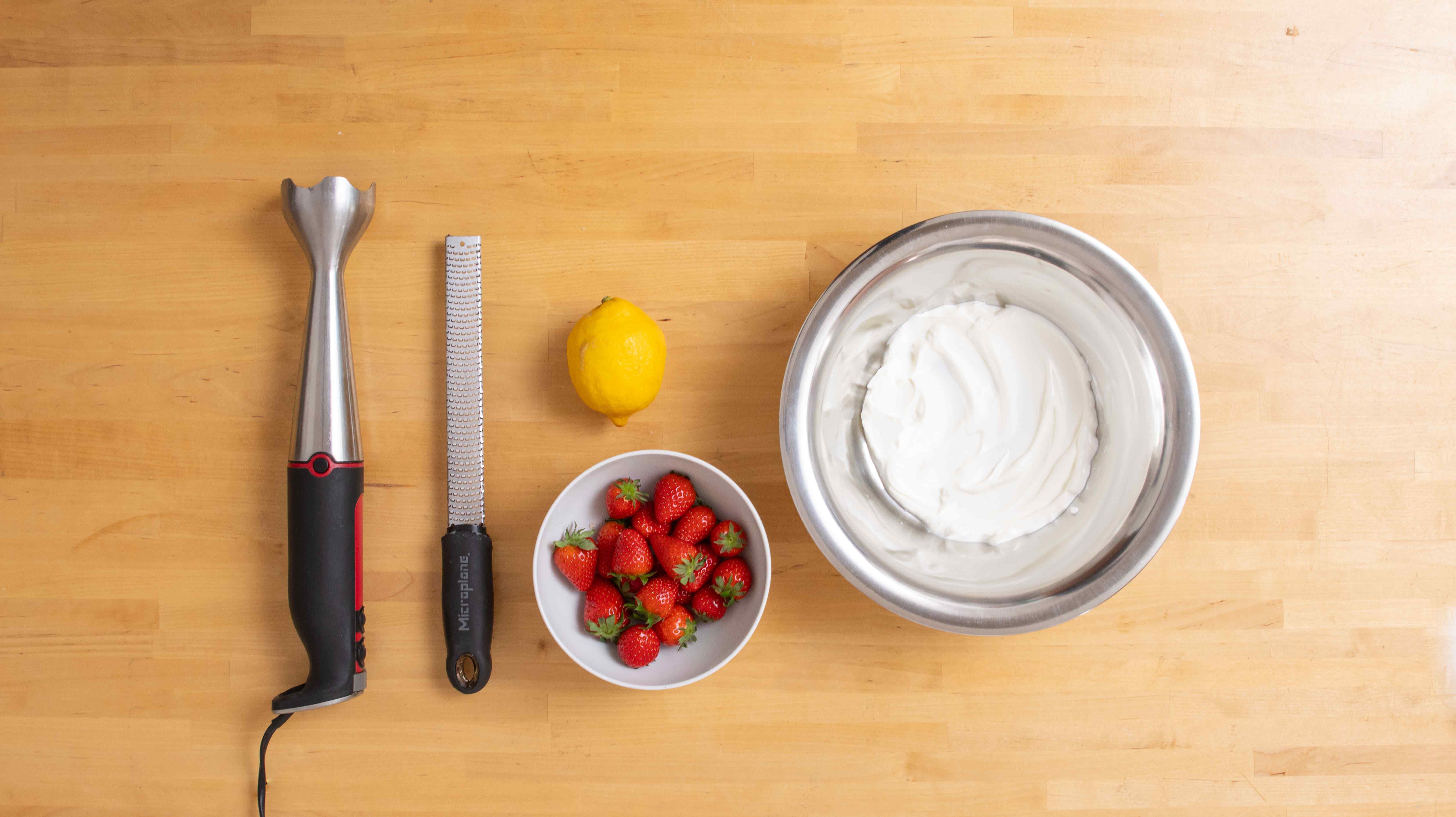 - Gelatine in kaltem Wasser einweichen, Erdbeeren putzen, waschen, pürieren und mit Joghurt sowie Zitronenabrieb verrühren, dann die aufgelöste Gelatine untermischen.