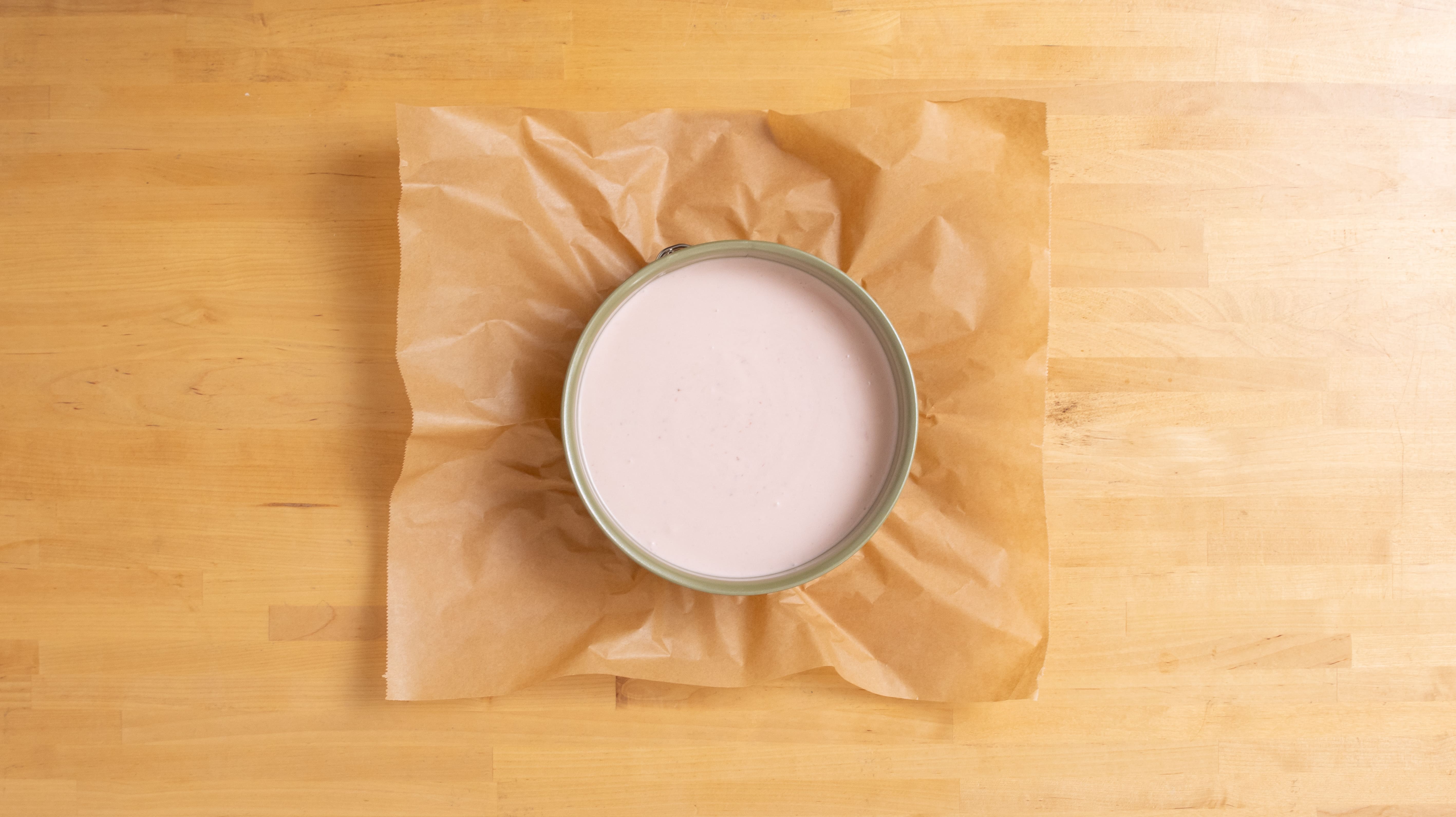 - Eine 22 cm Springform mit Backpapier auslegen, die Masse als Boden hineingeben, gut andrücken und 30 Minuten kaltstellen.