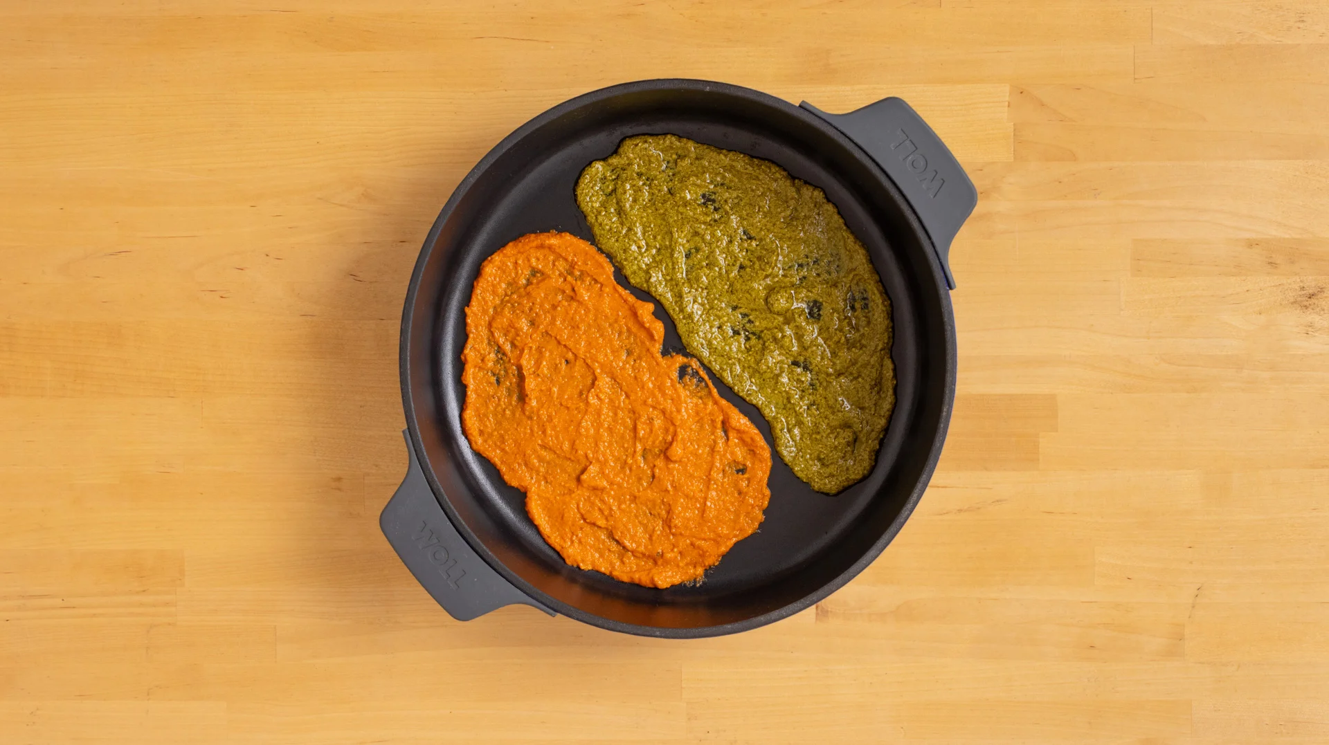 Eine beschichtete Pfanne auf der einen Seite mit dem grünen, auf der anderen Seite mit dem roten Pesto bestreichen. Je 2 Eier auf jede Seite als Spiegeleier auf das Pesto setzen.