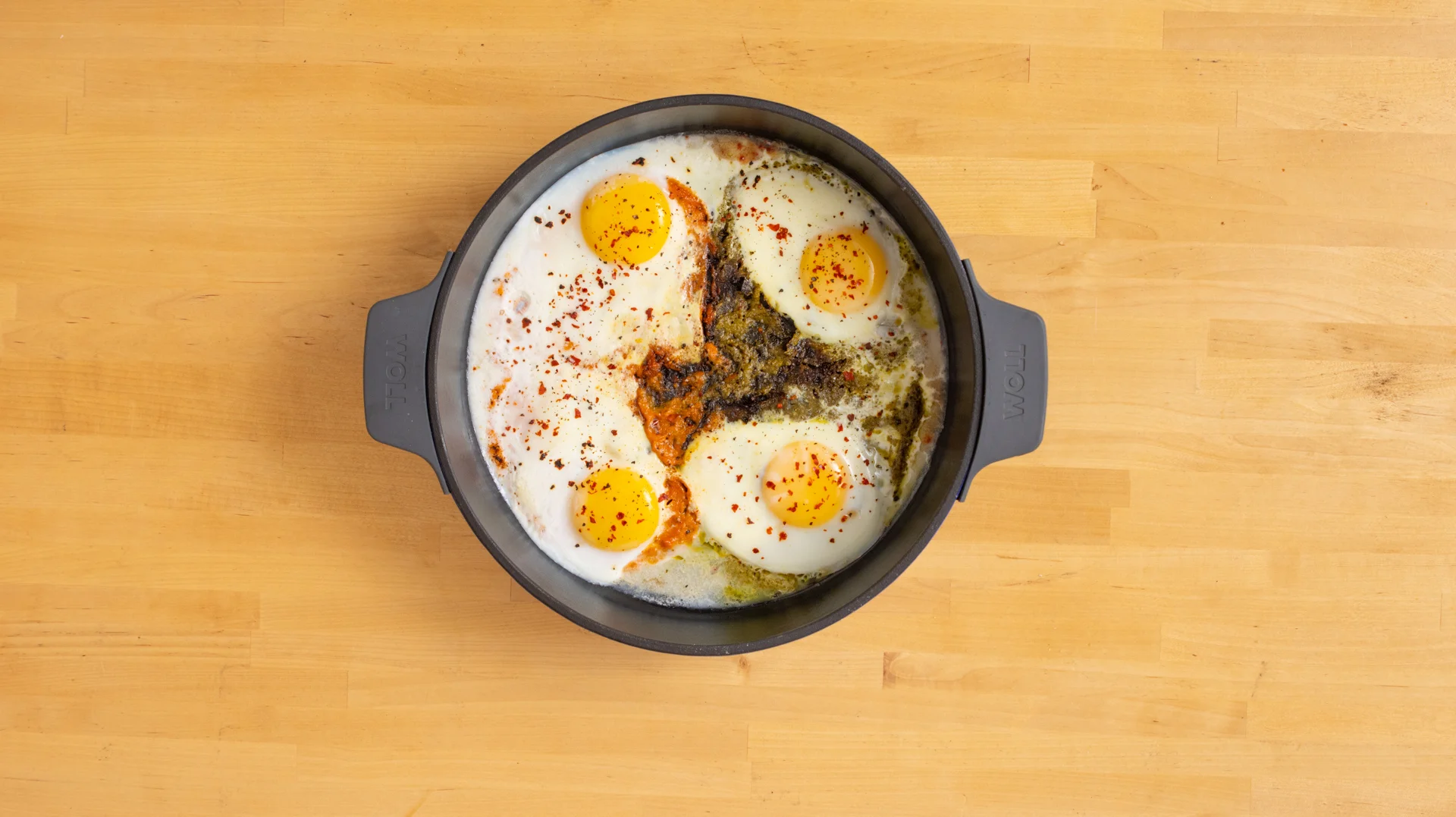 Bei mittlerer Temperatur mit Deckel erhitzen. Garen, bis das Eigelb fast fest ist. Mit flockigem Meersalz, Pfeffer und Chiliflocken würzen.