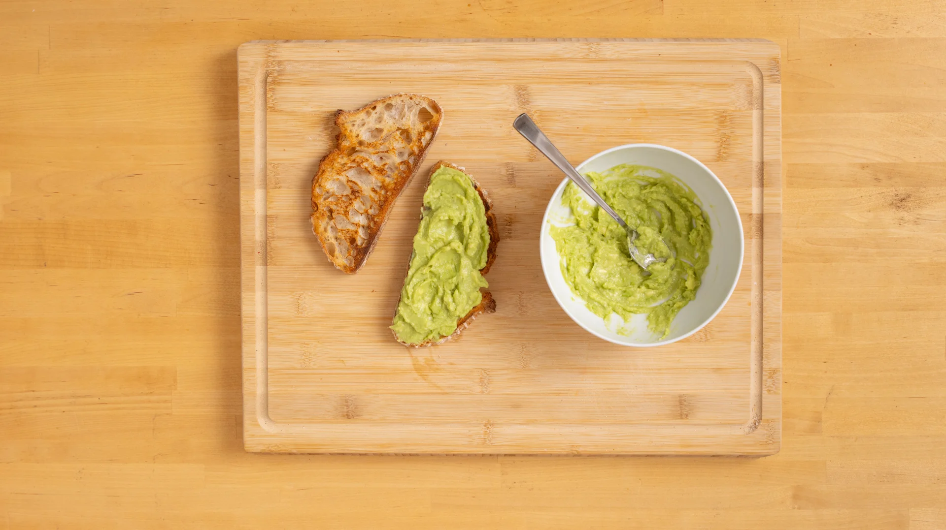 In der Zwischenzeit das Sauerteigbrot rösten. Avocado halbieren, entkernen und das Fruchtfleisch zerdrücken. Auf die beiden Brotscheiben aufteilen und verstreichen.