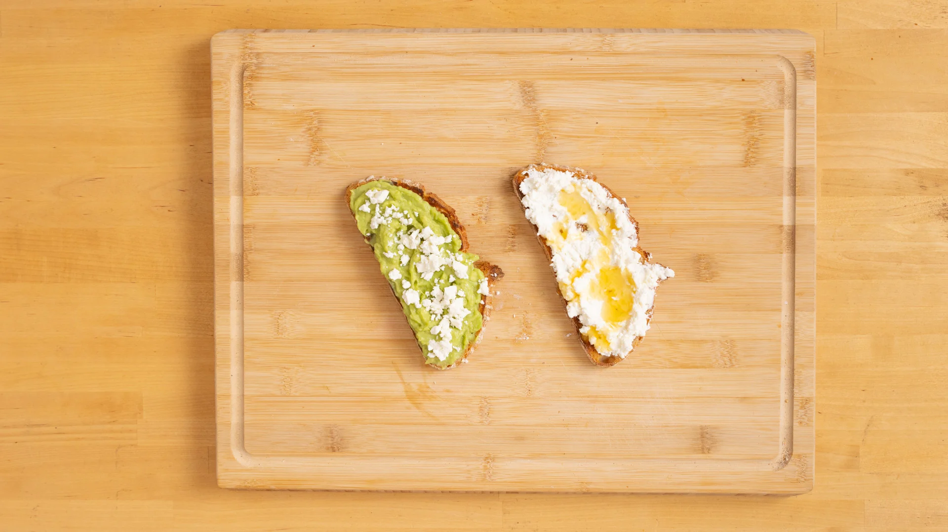 Eine Brotscheibe mit Ricotta bestreichen und mit Honig beträufeln, die andere mit zerbröckeltem Feta bestreuen.