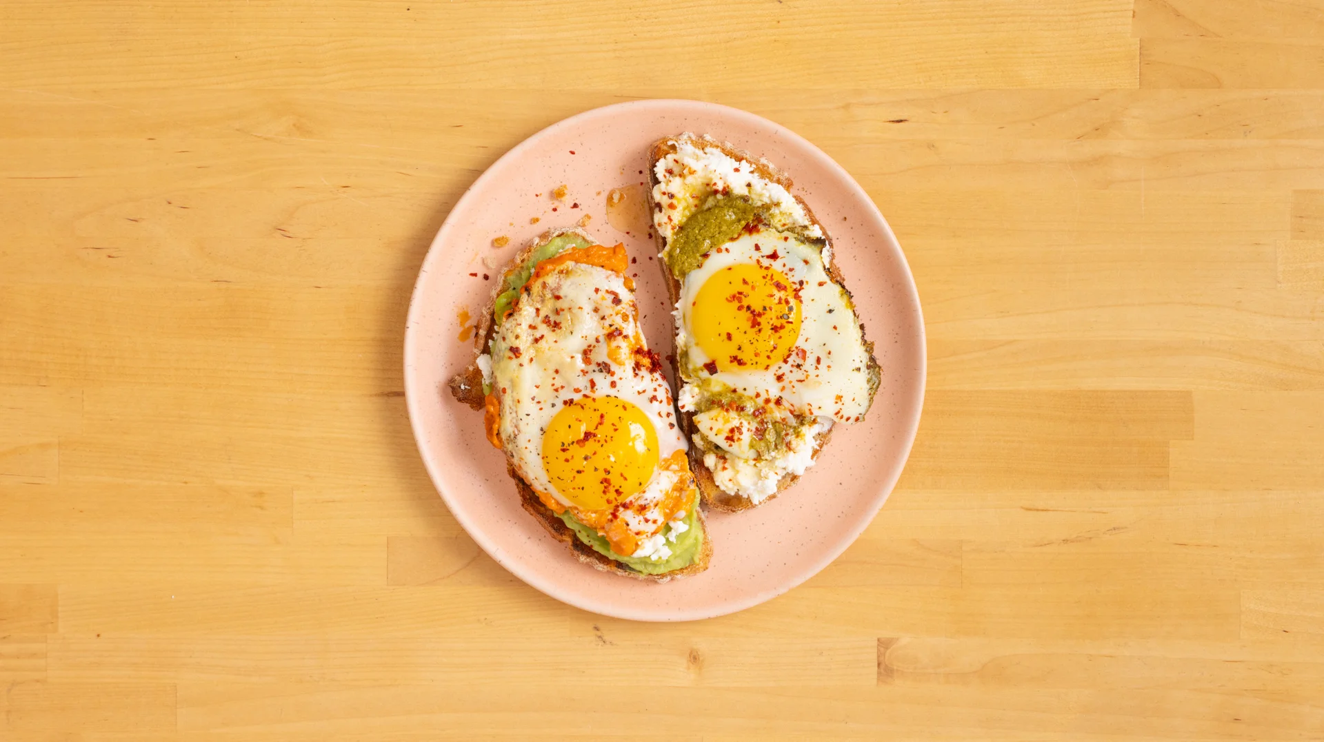 Die Ricotta-Brote mit den grünen Pesto-Eiern und die Feta-Brote mit rotem Pesto-Ei toppen.