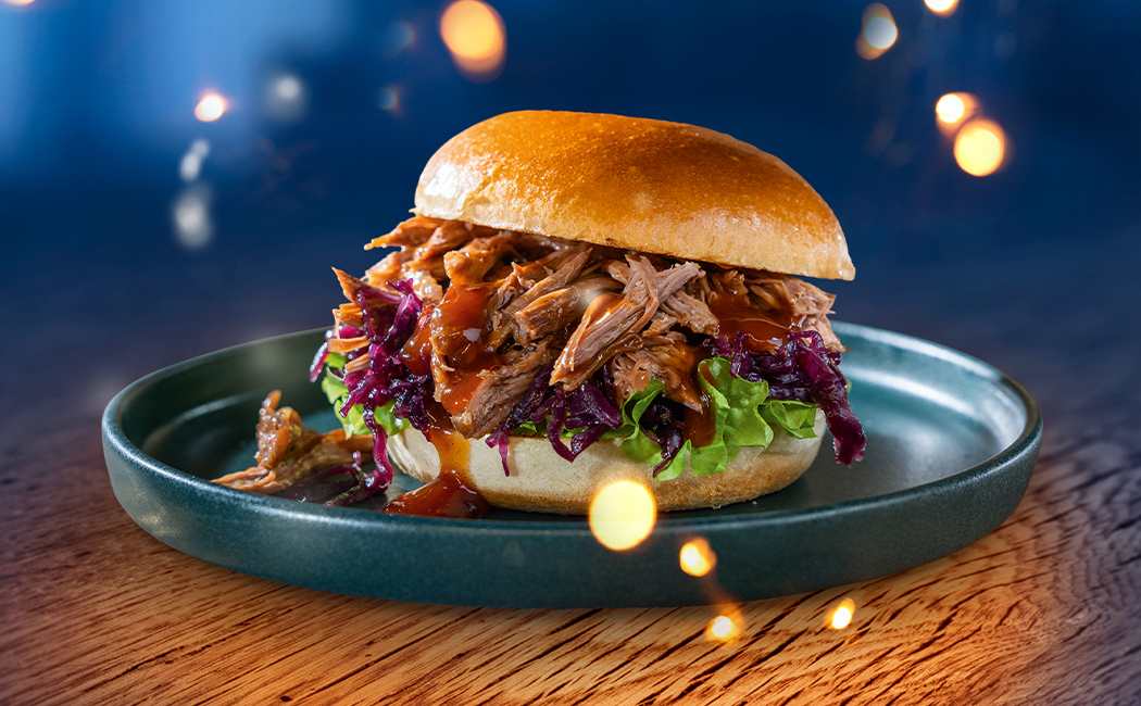 Und schon kann serviert werden! Pulled Gans, Rotkohl und BBQ-Sauce in die Buns füllen – fertig.