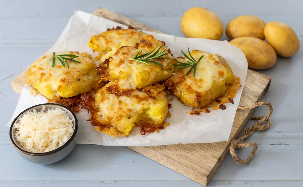 Die Pellkartoffeln vorsichtig mit dem Handballen flach drücken. Auf dem Backblech verteilen und dabei jeweils ein kleines Häufchen Parmesan unter den Kartoffeln platzieren.