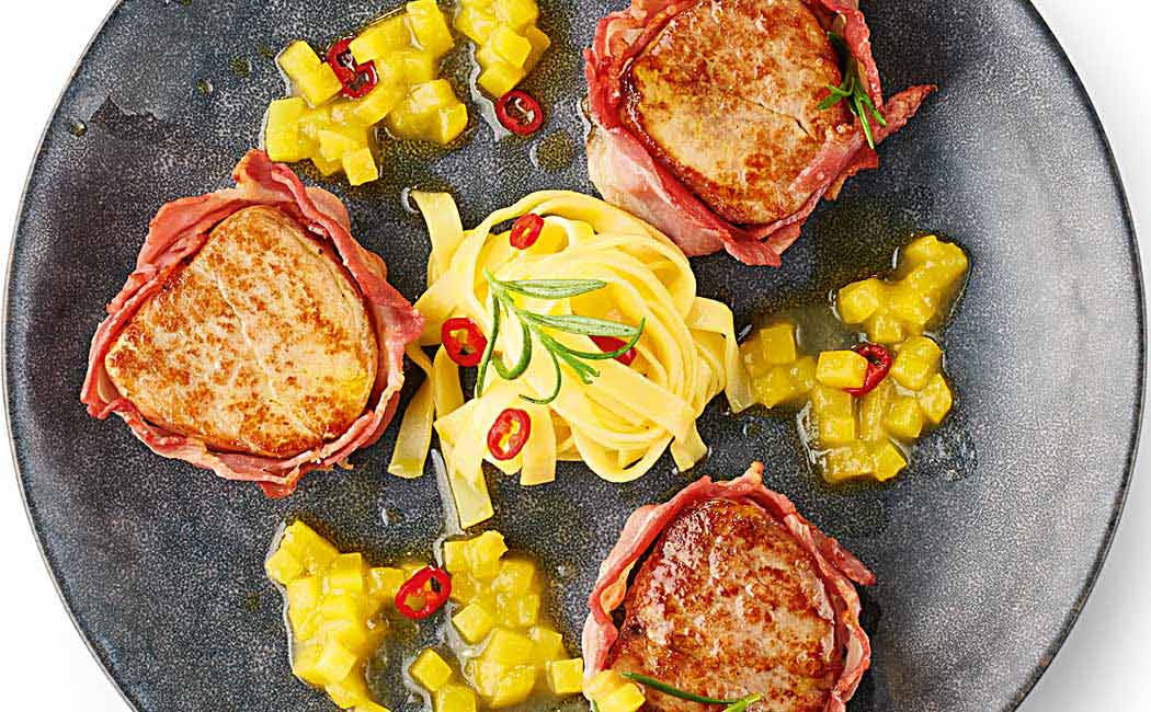Schweinefilet-Medaillons mit Salz und Pfeffer würzen und mit je einer Scheibe Speck umwickeln. In einer Pfanne bei mittlerer Hitze mit wenig Öl von allen Seiten anbraten und danach im Backofen bei 80°C 15-20 Minuten gar ziehen lassen.