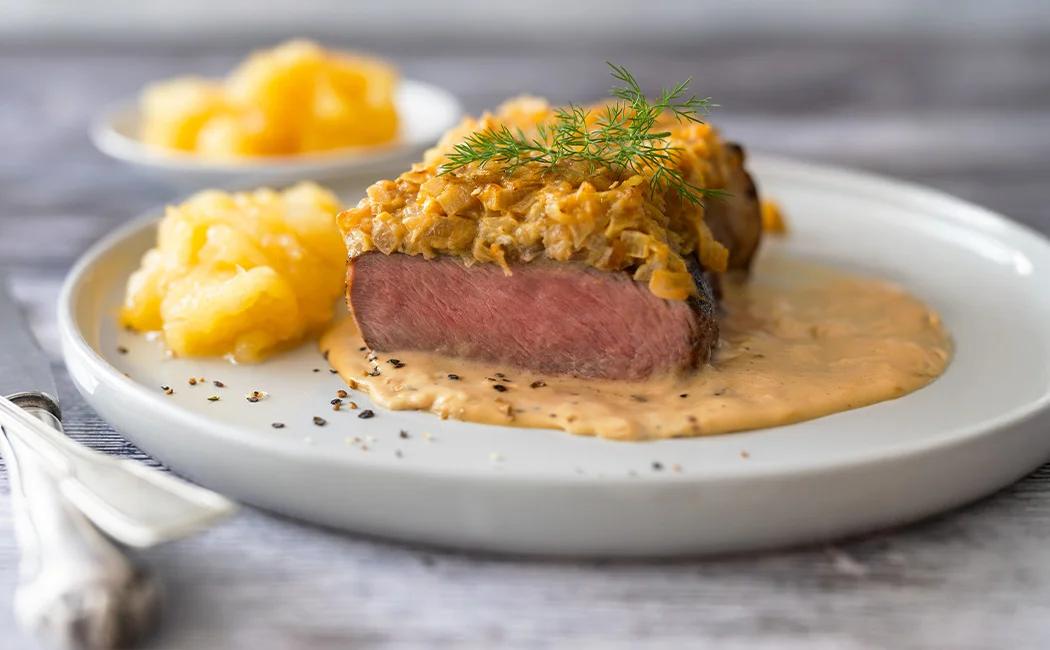 Die restliche Butter in der Fleischpfanne schmelzen und mit dem Mehl bestäuben. Rinderbrühe, übrigen Senf und Sahne einrühren, aufkochen und etwas einköcheln lassen. Mit Salz und Pfeffer würzen. Das Fleisch in die Sauce legen, aufkochen und zusammen mit dem Apfelkompott servieren.