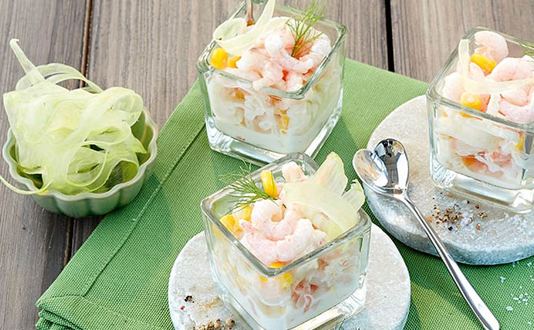 Anschließend Mayonnaise, Joghurt, Mais und Garnelen hinzugeben.