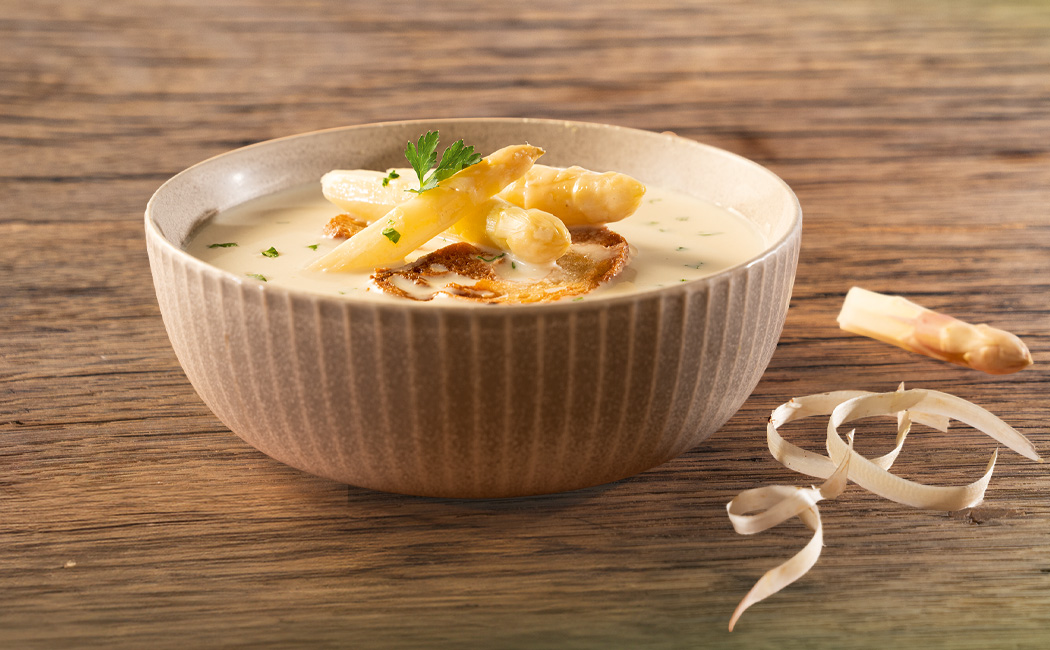 Herd nehmen, die Sahne mit dem Eigelb verquirlen und zur Suppe geben. Die Spargelcremesuppe darf nun nicht mehr aufkochen!