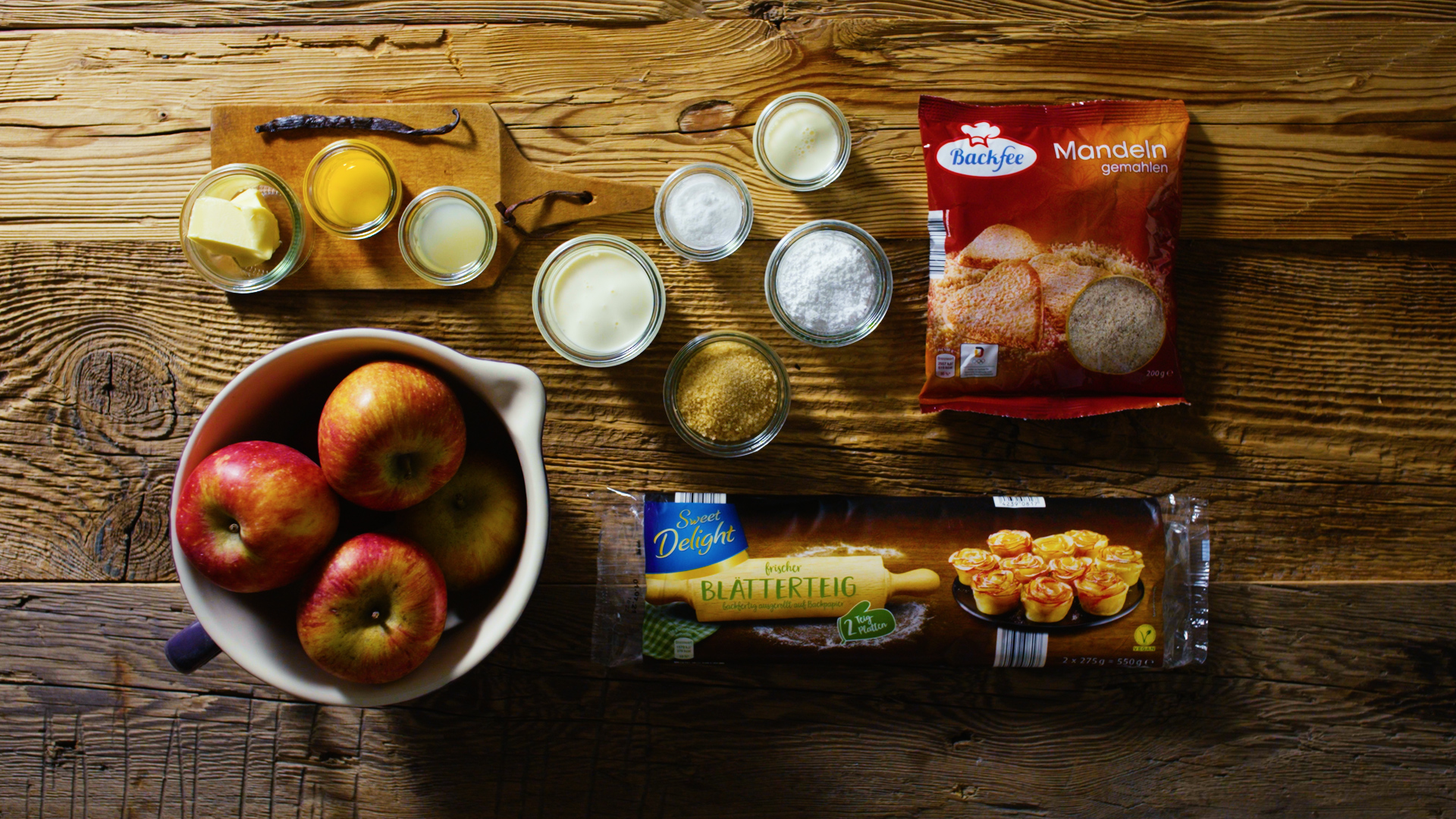 Den Blätterteig ausbreiten, mit der Butter bepinseln und mit den Mandeln bestreuen. Die Äpfel schälen, vierteln, entkernen und klein schneiden. Mit Zitronensaft, Stärke, Zucker und Vanille vermischen und gleichmäßig auf dem Teig verteilen.