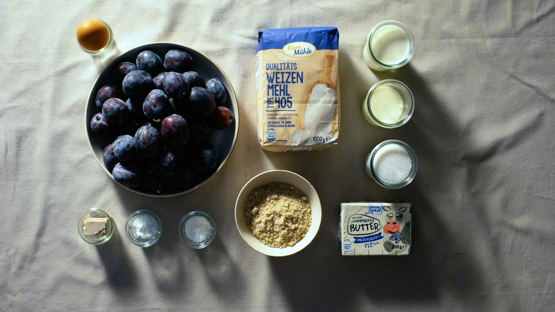 Für den Belag die Zwetschgen waschen, entsteinen und vierteln. Für die Streusel das Mehl mit dem Zucker und der Butter zu Krümeln verkneten.