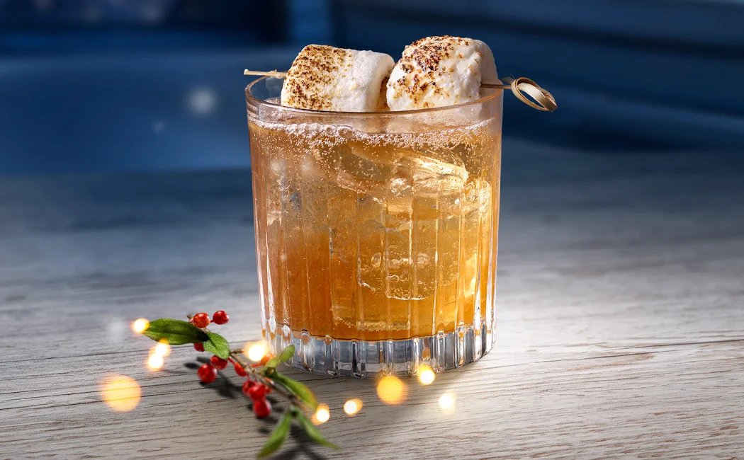 Rösten Sie die Marshmallows (falls verwendet) mit einem Bunsenbrenner oder direkt über der Flamme eines Gasherds. Stecken Sie die Marshmallows auf einen Spieß und garnieren Sie das Glas.