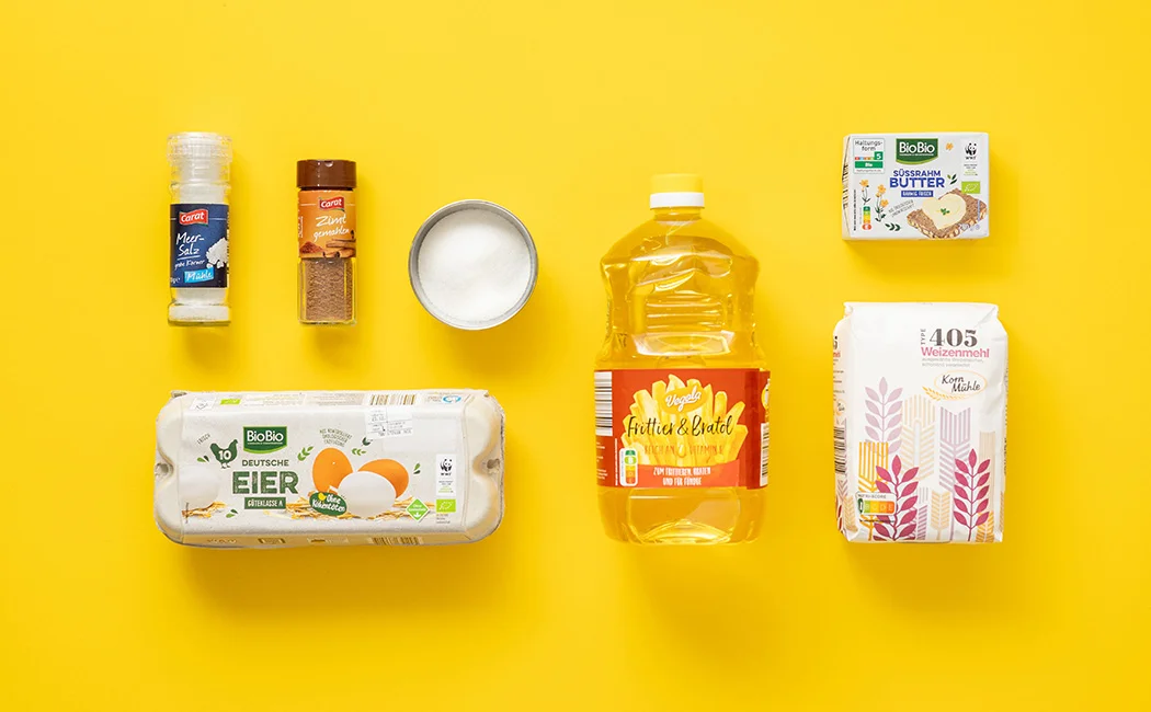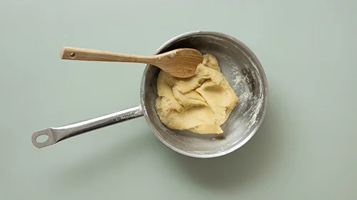 240 ml Wasser mit Butter und 15 g Zucker und dem Salz aufkochen. Das Mehl im Ganzen dazugeben und kräftig rühren, bis sich ein Teigklumpen gebildet hat und am Topfboden weiß „angebrannt“ ist. Daher der Name „Brandteig“.