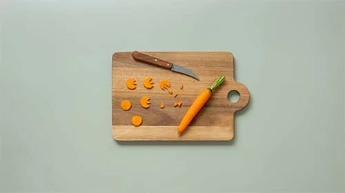 Die Möhre schälen und 16 Scheiben herausschneiden. Aus jeder Scheibe 2 Zacken heraustrennen, sodass die Scheiben wie Füße mit 3 Zehen aussehen. 8 der ausgeschnittenen Zacken als Küken-Schnäbel beiseitelegen.