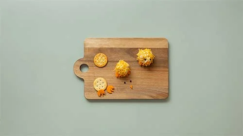 Den Frischkäse zu 8 Bällchen formen und im Käse wälzen. Je einen Cracker mit je 2 Füßen belegen, eine Frischkäsekugel aufsetzen und leicht andrücken. Küken-Schnäbel und Pfefferkörner als Augen vorsichtig festdrücken.