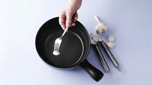 Für das Käsefondue die Knoblauchzehe schälen, mit einem Messer oder einem schweren Gegenstand andrücken und damit den Fonduetopf ausreiben. Anschließend die Knoblauchzehe pressen oder fein hacken.