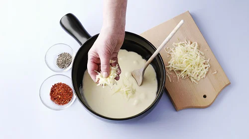 Den geriebenen Käse nach und nach in den erhitzten Weißwein geben und mit einem Holzlöffel gut umrühren bis der Käse geschmolzen ist. Salz, Muskatnuss, Pfeffer und Paprikapulver hinzugeben und verrühren.