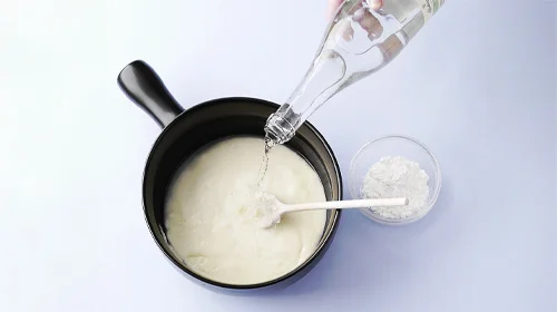 Den Weißwein in den Fonduetopf geben und auf dem Herd oder direkt über dem Rechaud einmal aufkochen. Währenddessen die Schalotte schälen und fein würfeln. Zusammen mit dem Knoblauch zum Weißwein geben.