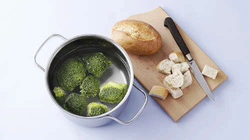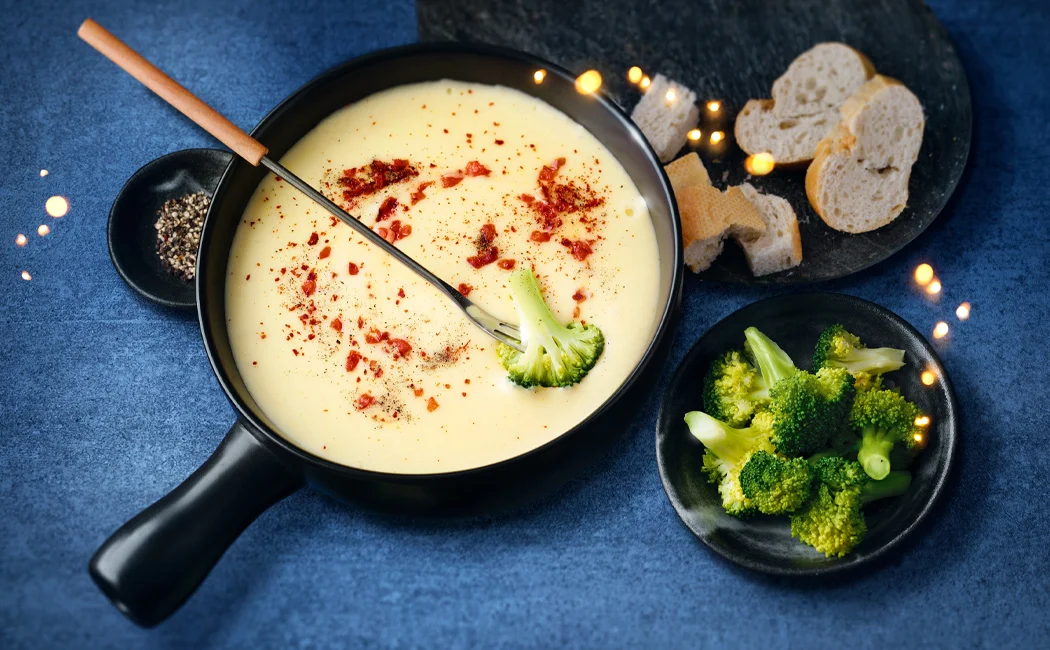 Während das Fondue köchelt, das Baguette in ca. 2 x 2 cm große Würfel schneiden. Brokkoli in Röschen schneiden und kurz blanchieren. Ebenso die Champignons vierteln und zur Seite stellen. Das Käsefondue mit dem Brot, Brokkoli, Champignons und auf Wunsch weiteren Beilagen auf dem Rechaud servieren. Guten Appetit!