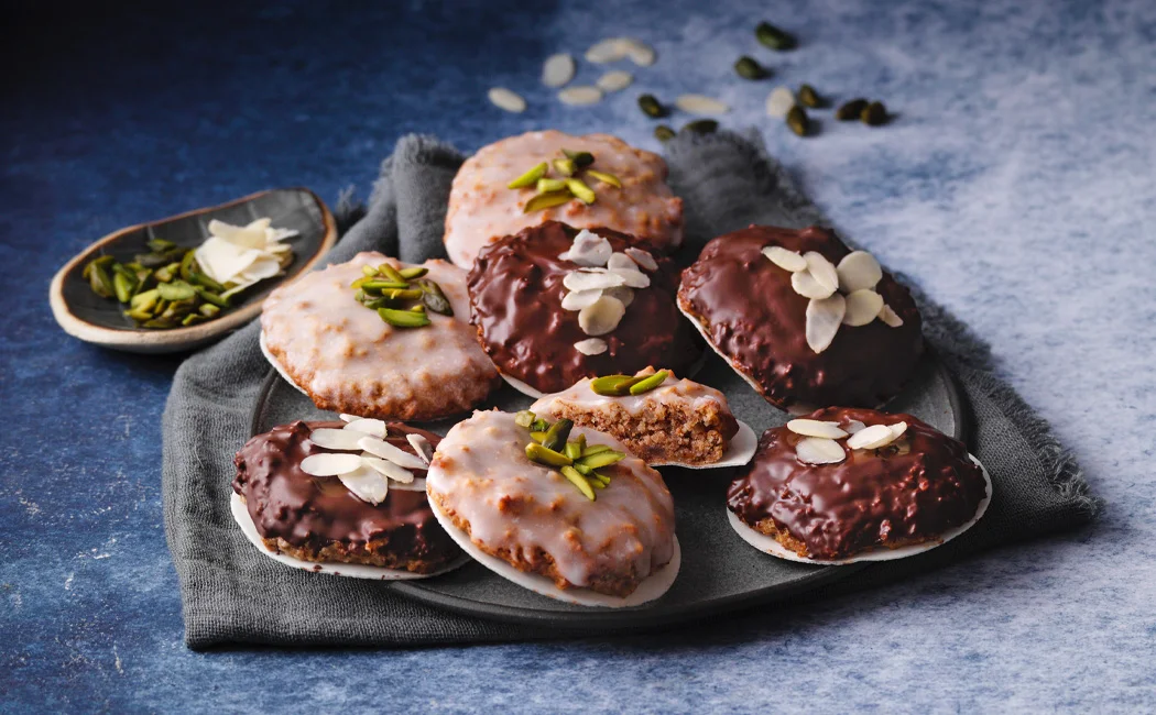- Die Kuvertüre schmelzen und die Hälfte der Oblaten damit bestreichen. Puderzucker und Zitronensaft zu einem Guss verrühren und die restlichen Oblaten damit bepinseln. Nach belieben mit Mandelblättern und gehackten Pistazien bestreuen.