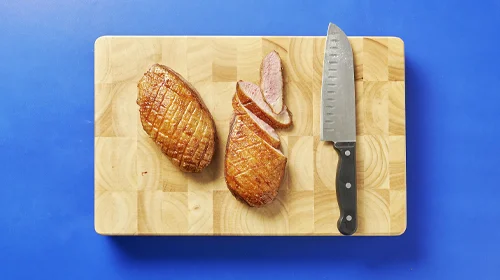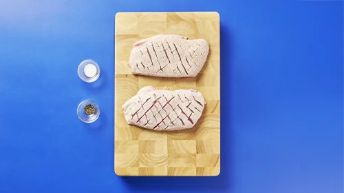 Die Entenbrüste trocken tupfen und die Entenhaut rautenförmig einschneiden. Mit Salz und Pfeffer würzen.