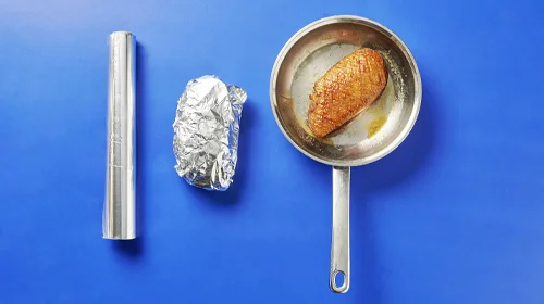 Mit der Hautseite nach unten in einer heißen Pfanne ohne Fett ca. 3 Minuten anbraten. Für ca. 3 Minuten wenden, dann auf der Pfanne nehmen und einzeln in Alufolie einwickeln.