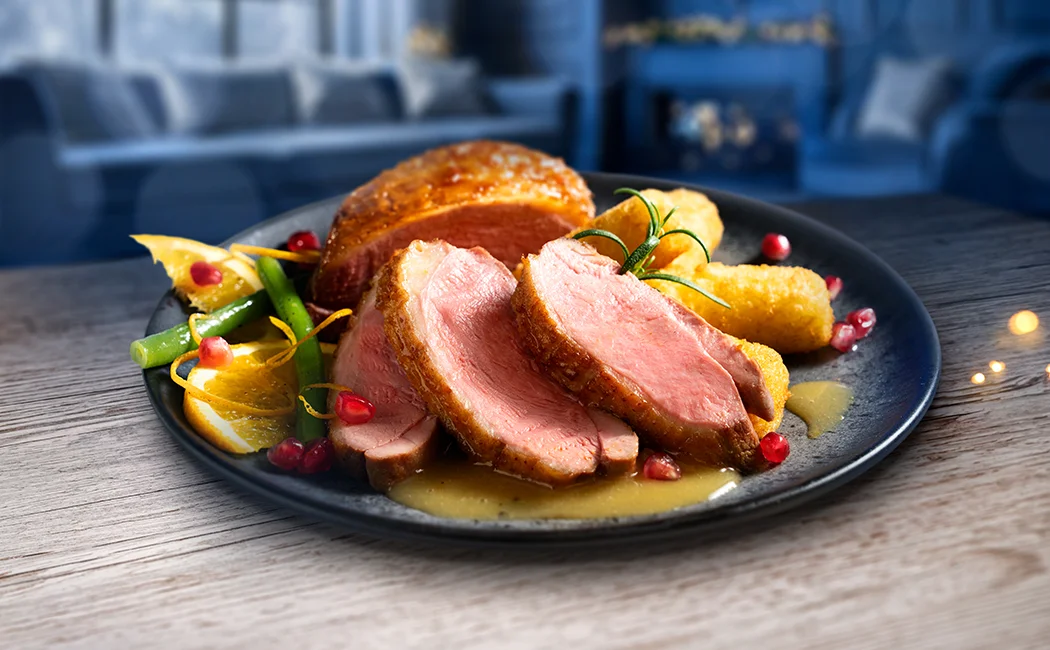 Entenbrüste auspacken und unter dem eingeschalteten Backofengrill mit der Hautseite nach oben 6-8 Minuten kross werden lassen. Entenbrüste in Tranchen schneiden und auf Tellern anrichten.