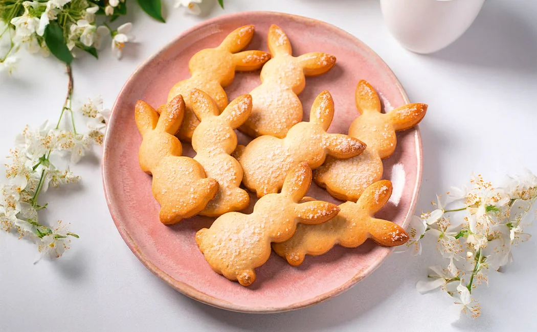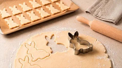 Teig auf bemehlter Fläche ca. 1 mm dünn ausrollen. 12 große Hasen (ca. 12 cm) ausstechen und auf den Backblechen verteilen. Die Bleche nacheinander im Ofen jeweils ca. 12 Minuten hellbraun backen.