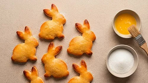 Die ausgekühlten Hasen auf einer Seite mit flüssiger Butter bepinseln und mit Zucker bestreuen. Nach Belieben mit Geschenkband als Schleife um den Hals dekorieren.